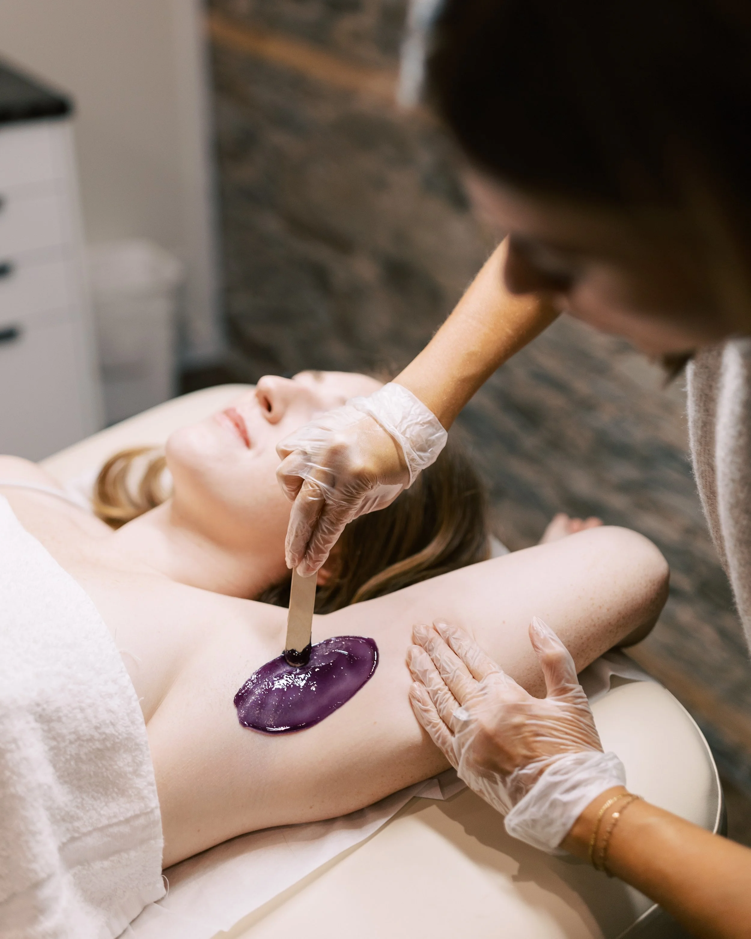 We use a combination of both hard and soft waxes. Hard wax doesn't adhere to the skin making it the best choice for sensitive areas like the face, underarms or intimate areas!